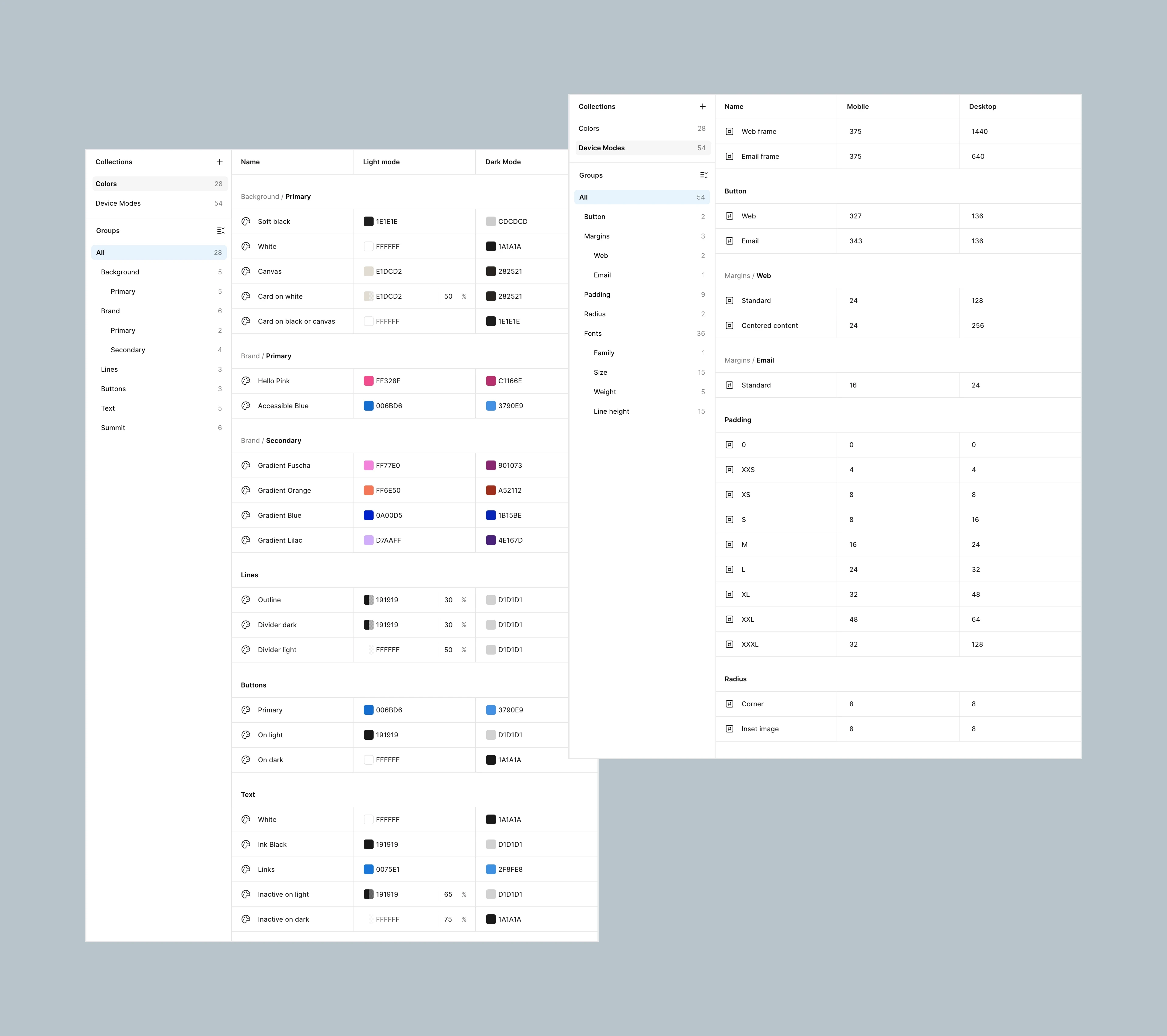 Every component was built using Figma variables for color, typography, and spacing. This made the library resilient to the ongoing brand refresh—when brand elements changed, components updated seamlessly rather than requiring manual edits across files. It also enabled mode switching: designs could toggle between light and dark mode and between mobile and desktop layouts without any manual edits, making it faster to explore and present variations.
